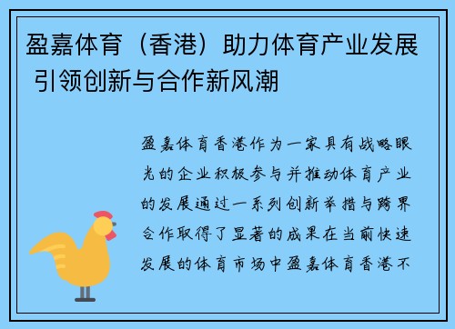 盈嘉体育(香港)作为一家具有战略眼光的企业,积极参与并推动体育产业的发展,通过一系列创新举措与跨界合作,取得了显著的成果。在当前快速发展的体育市场中,盈嘉体育(香港)不仅凭借其强大的资源整合能力和行业影响力,塑造了多元化的体育生态系统,还通过技术创新和全球合作引领了行业的新风潮。本文将从四个方面详细探讨盈嘉体育(香港)如何助力体育产业发展,展现其在推动行业创新与合作方面的独特贡献。这四个方面分别为:盈嘉体育(香港)在创新模式上的突破、盈嘉体育(香港)推动跨界合作的成功案例、盈嘉体育(香港)如何利用数字化手段提升体育产业价值以及盈嘉体育(香港)在全球化视野下的发展战略。这些内容将为了解盈嘉体育(香港)在体育产业中的引领作用提供全面的视角。