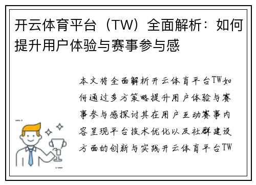 开云体育平台(TW)全面解析:如何提升用户体验与赛事参与感